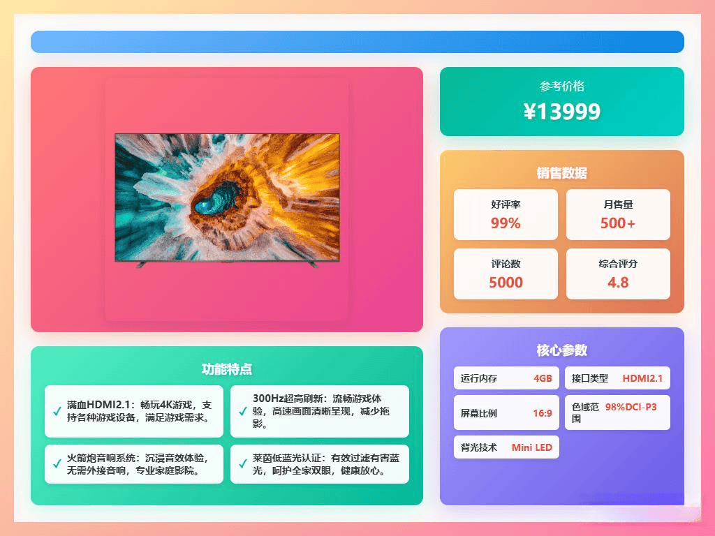高清画质与音效:这款电视采用了原色高画质Mini LED背光和动态背光控制,画面色彩还原自然,亮度高且层次丰富。配合火箭炮音响和环绕立体声技术,声音清晰且环绕感强,无论是观看电影还是听音乐,都能感受到震撼的效果。